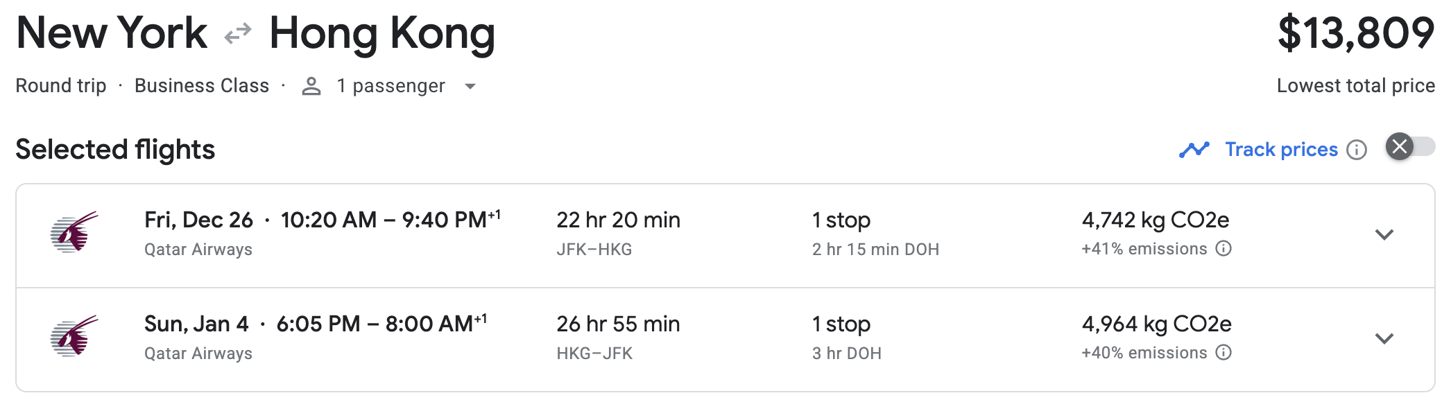 - Booked two Qatar Airways business-class roundtrips SFO-HKG during peak New Year’s space.