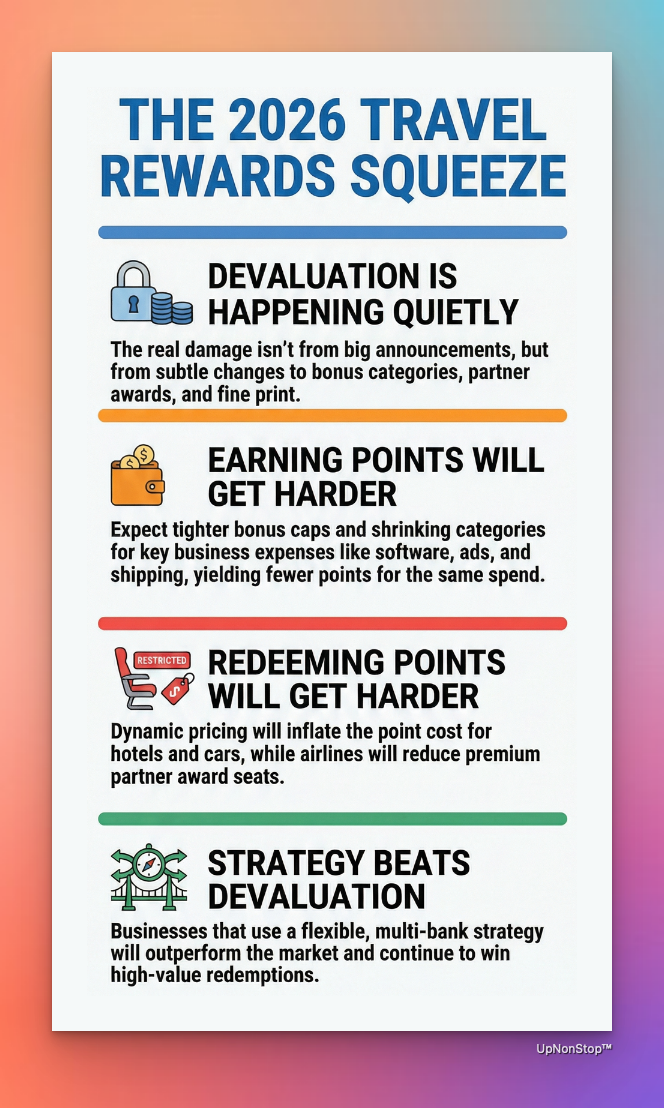 In 2026, the real damage happens quietly: shrinking bonus categories, partner award tightening, dynamic pricing creep, and business-card fine print that trims earn potential without most businesses noticing. None of these moves make headlines - but every one of them reduces the value of an uninformed companyâs points balance.