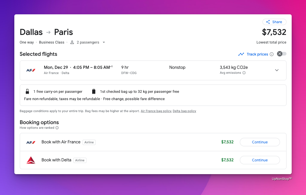 An Austin-based digital consultant and his partner used UpNonStop to turn everyday business spend into two business-class tickets to Paris for New Year’s Eve, worth $7,532 in total. By leveraging a 3.1% earn rate across their cards and an Amex 20% transfer bonus, they only needed 100,000 Amex points plus $485 in taxes instead of the usual 120,000 points.
