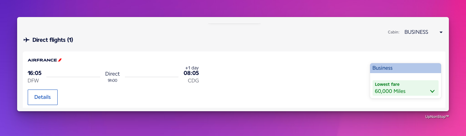 Their upcoming experience will be premium: access to the DFW SkyTeam lounge, lie-flat seats on Air France business class, Michelin-quality meals, and priority service. This illustrates how UpNonStop optimizes not just point accumulation, but the full travel experience, turning routine business spend into real, tangible luxury.