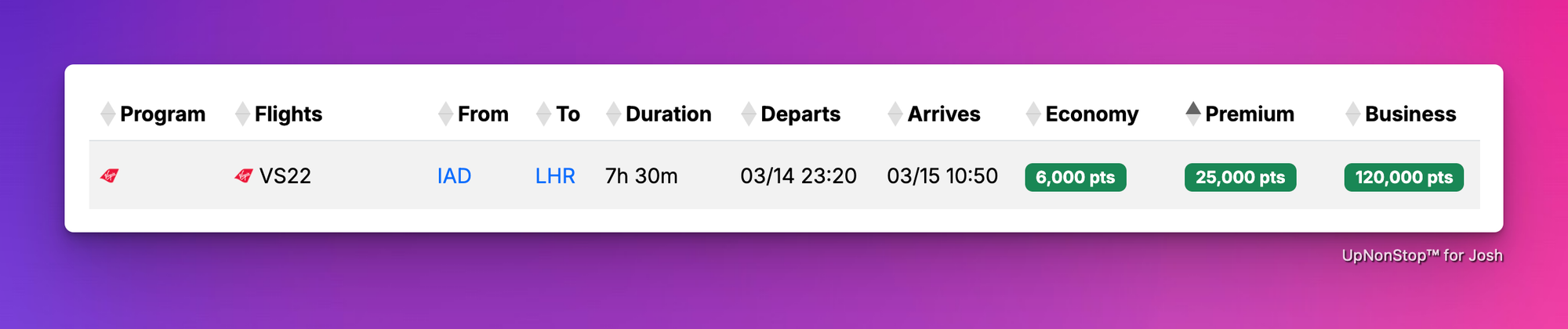 Josh wants to take his wife and three kids to London for Spring Break. With Chase’s 40% Virgin bonus, transferring 125K points instead of spending 350K-800K in the portal can save him thousands. If he finds five saver seats, that’s a 6–9% return... real yield, not status.