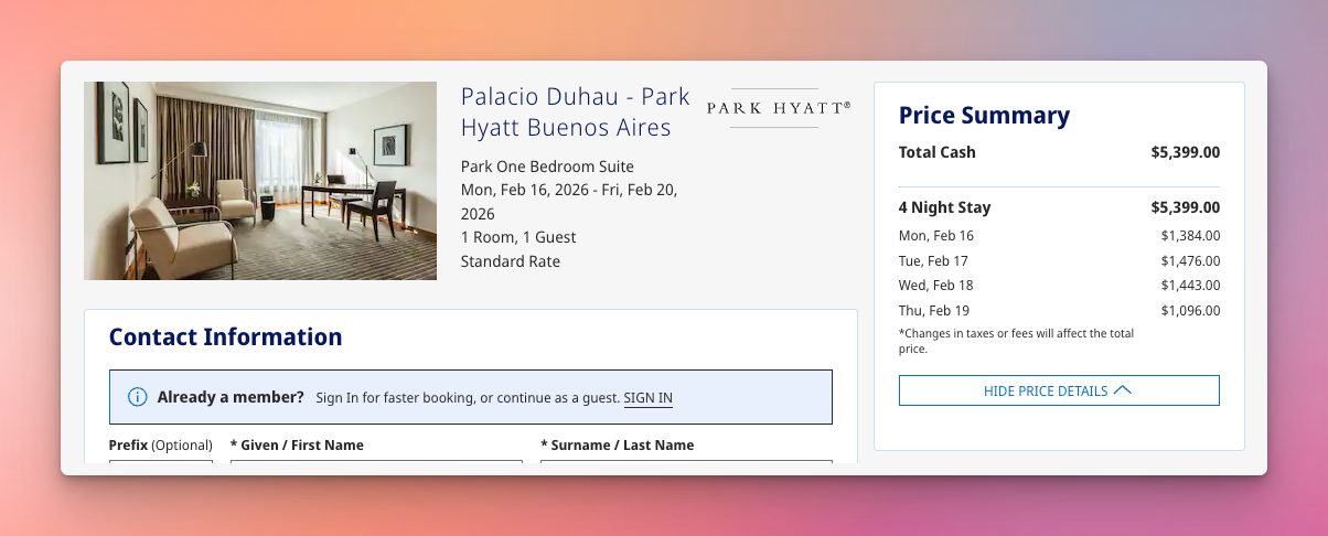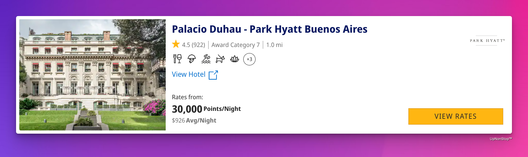 - 120,000 Chase Ultimate Rewards points were transferred to Hyatt once availability at Palacio Duhau was confirmed