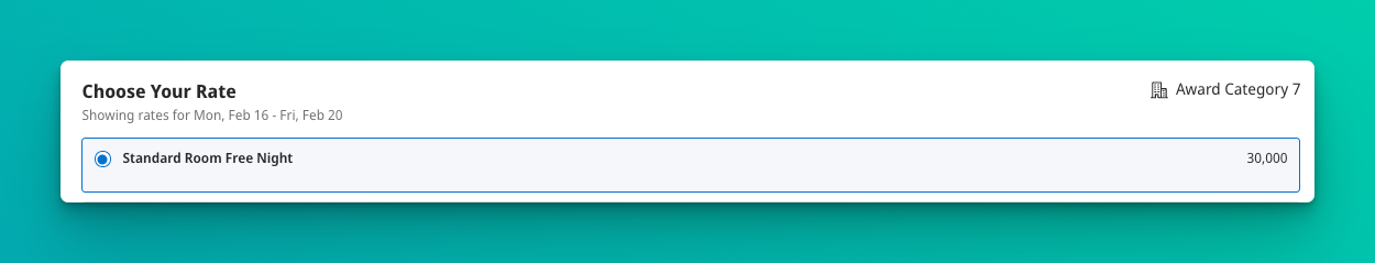 Points Required: 30,000 Hyatt points per night = 120,000 points total