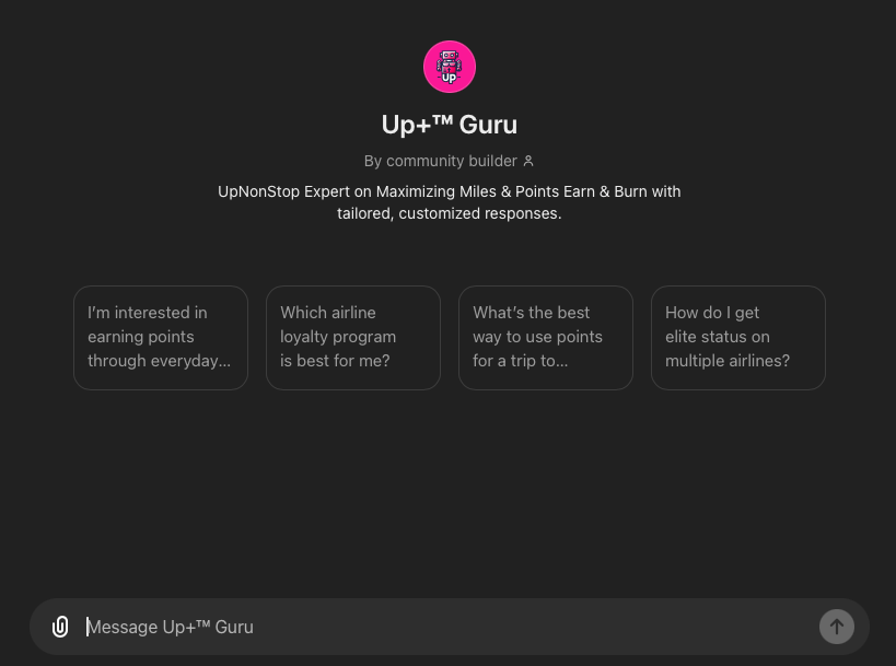 Up+™ Guru, a specialized GPT designed exclusively for Up+ Premium Members, offers a wealth of expert knowledge, covering everything from optimizing award travel and loyalty programs to staying informed on industry updates. Whether you are a seasoned traveler or someone just beginning to dip your toes into the world of points and miles, Up+™ Guru will help you make informed decisions to maximize the value of every mile and point.