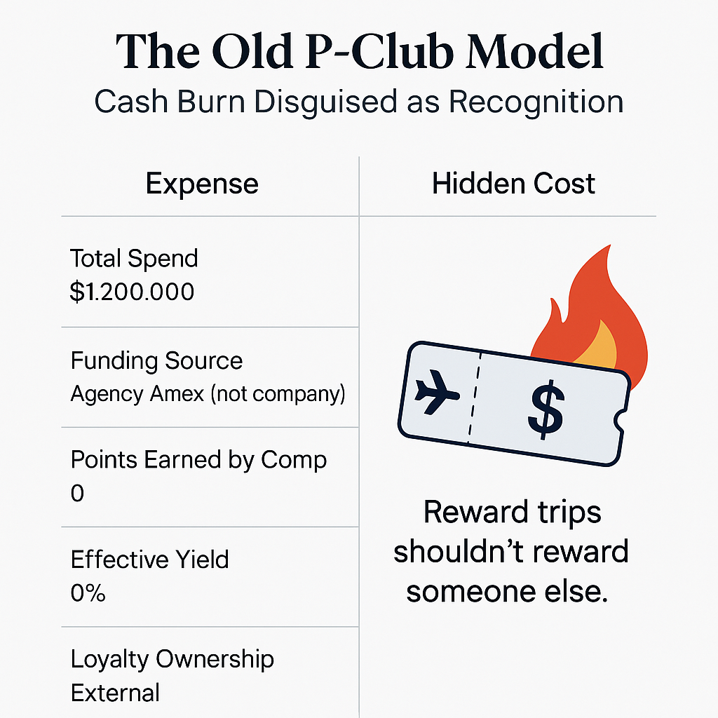 Most companies treat their Presidents Club trips as an expense - a costly “thank you” that burns cash and builds zero future value. $1.2 million goes out, a travel agency earns the points, and everyone applauds the illusion of generosity. But under the surface, that loyalty debt compounds. Every unoptimized dollar becomes someone else’s asset.